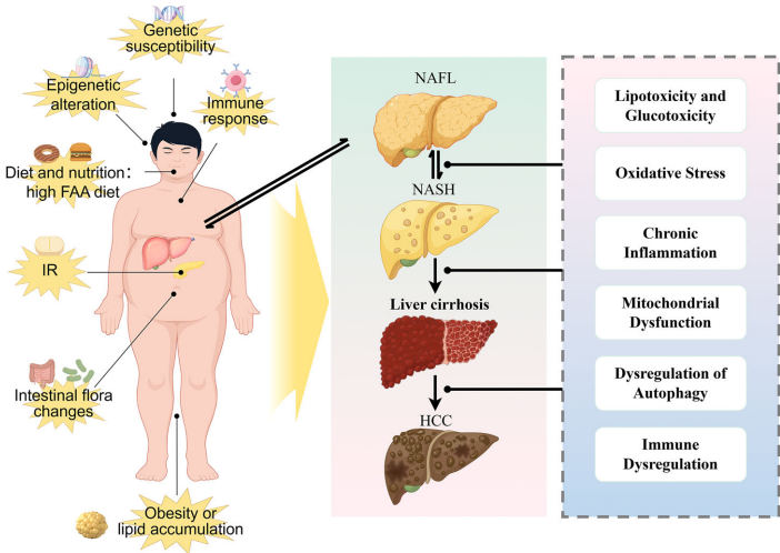 非酒精性脂肪性肝炎(NASH)作为非酒精性脂肪肝病(NAFLD)的炎症亚型,其典型病理特征包括脂肪变性、肝细胞气球样变、小叶炎症和纤维化。随着代谢紊乱的持续发展,NASH可通过慢性炎症过程促进致癌微环境形成,最终导致终末期肝病包括肝细胞癌(HCC)和肝功能衰竭。值得注意的是,约30%-40%的NASH相关HCC发生在非肝硬化患者中,使其成为非肝硬化HCC的首要病因。