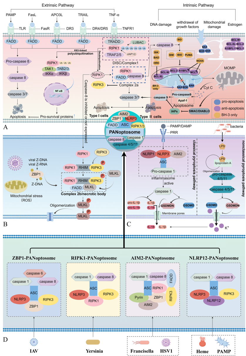 ZBP1-PANoptosome等复合物可同时启动凋亡、坏死性凋亡和焦亡,为多靶点干预提供理论依据。中药四物汤通过抑制mtDNA转移减轻肝细胞PANoptosis的发现,为传统药物现代化研究提供范例。