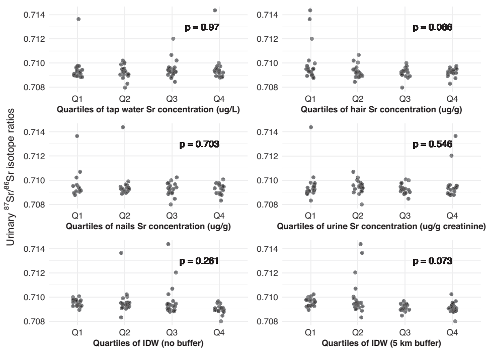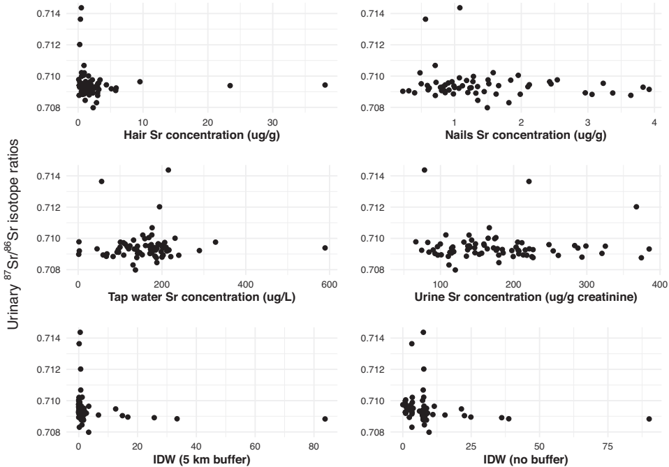 水锶浓度与同位素方差无关联,而头发作为两月内暴露标志物显示出最强相关性,暗示持续暴露可能导致源特征趋同。
