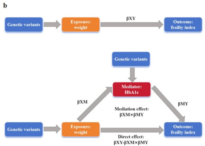 本研究针对二甲双胍与衰弱指数(FI)的因果关系这一科学问题,通过两样本孟德尔随机化(MR)分析,首次揭示二甲双胍靶向线粒体复合物I(MCI)介导的体重降低可显著改善衰弱状态(β:-0.41,95%CI:-0.74至-0.07),并证实糖化血红蛋白(HbA1c)在体重与FI关系中起5.5%的中介作用,为抗衰老药物开发提供了新靶点。