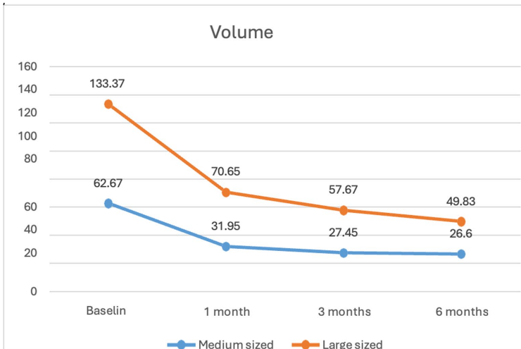 两组6个月时体积缩小率无差异(中等56.42% vs 大体积极60.71%,p=0.055),