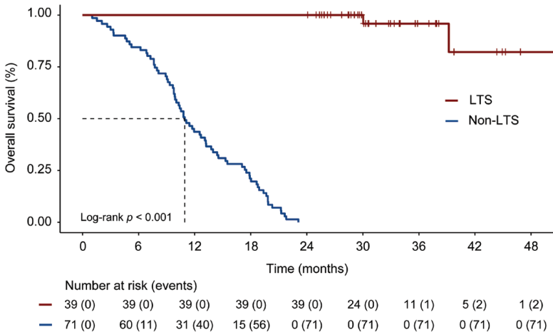 生存分析结果:中位随访31.3个月,全组中位OS和PFS分别为17.9个月和11.8个月。LTS组36个月和48个月生存率分别达到95.8%和82.1%,显著优于非LTS组的10.9个月中位OS(P<0.001)。