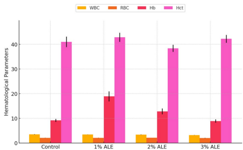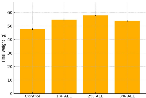 研究采用240尾初始体重33.9±1.14 g的尼罗罗非鱼,分为4组(0.00%、1.00%、2.00%、3.00% ALE添加),进行30天养殖实验。通过测定终末体重、饲料系数(FCR)、特定生长率(SGR)等评估生长性能;使用全自动血液分析仪(MS4-S)检测白细胞(WBC)、红细胞(RBC)、血红蛋白(Hb)等血液参数;采用生化分析仪(MScan II)测定血糖(GLU)、胆固醇(CHOL)、碱性磷酸酶(ALP)等12项血清指标。