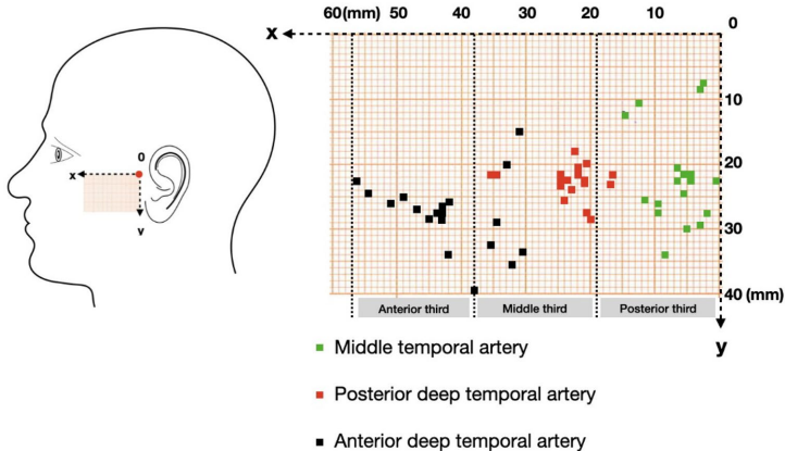 为解决这一临床难题,来自中国的研究团队开展了这项开创性的尸体研究。研究采用创新的三维定位方法,以颧弓后角为坐标原点建立参考轴线,通过乳胶灌注技术使血管显影,系统测量了19例半侧面部标本中三条主要动脉的起源位置。测量数据被转化为毫米级坐标图,首次实现了颞区血管的精确空间定位。