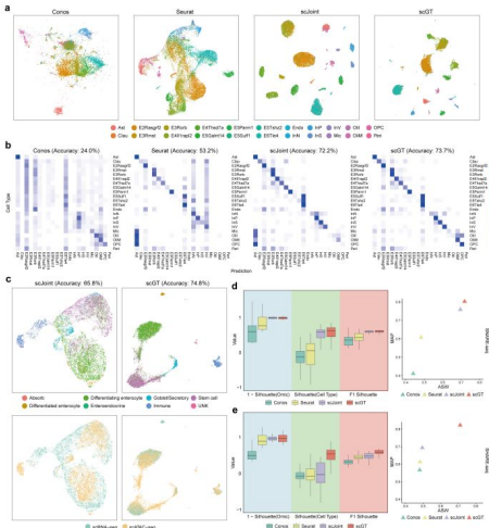 在SNARE-seq小鼠大脑皮层和SHARE-seq小鼠结肠数据中,scGT的UMAP可视化显示更清晰的细胞类型分离(图2a)。定量指标显著优于基线方法:细胞类型轮廓系数(Silcelltype)提升15%,F1分数达0.82,且平均精度(MAP)提高0.2以上(图2d)。特别是对少见的少突胶质前体细胞(OPC)的识别准确率提升37%。