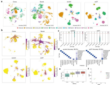 对人类心肌梗死数据的分析显示,scGT能有效分离仅存在于snATAC-seq中的髓系细胞(图4a红色圈注),其未知类型识别准确率达92.9%。置信度评分 violin图显示scGT对非常见细胞类型的低置信度响应更特异(图4c)。