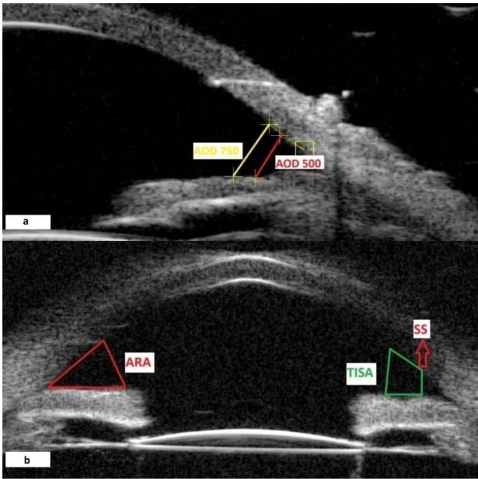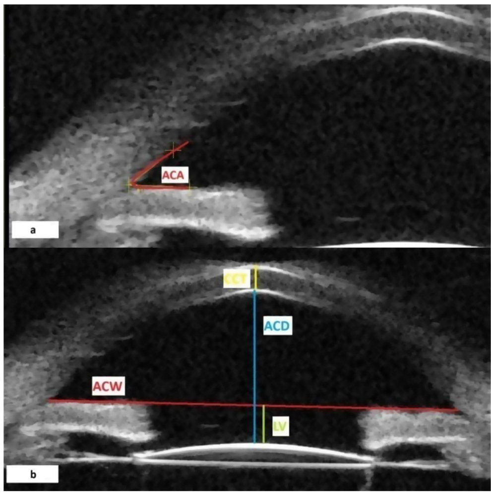研究采用前瞻性队列设计,纳入34例单眼PCO患者(均植入AcrySof SA60 IOL)。使用50MHz UBM探头在暗室条件下测量鼻/颞侧前房参数,包括:前房角宽度(ACA)、500/750μm处角开放距离(AOD500/AOD750)、小梁-虹膜空间面积(TISA500/TISA750)等。所有患者接受标准化Nd:YAG激光治疗(能量0.9-3.0mJ/脉冲,囊膜开口4.0-4.5mm),术前术后均予溴莫尼定预防性降眼压。