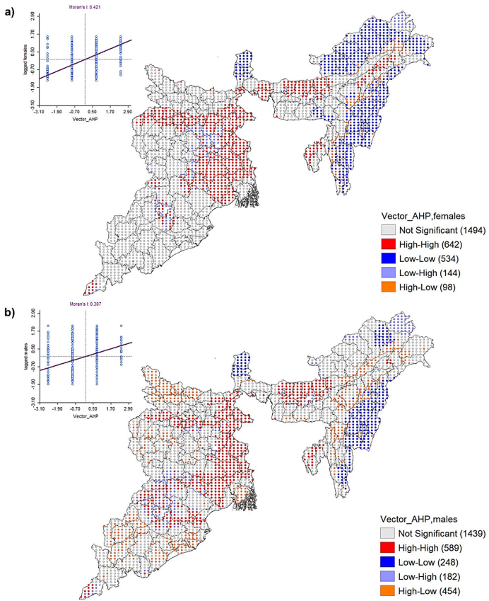 国际人口科学研究所的研究团队Lobsang Tshering Bhutia和Aparajita Chattopadhyay开展了一项开创性研究。他们首次将环境流行病学与空间分析相结合,利用印度第五次全国家庭健康调查(NFHS-5)的214,231名女性和25,953名男性数据,构建了包含海拔、年均温(>20°C阈值)、年降雨量(1500-2000mm关键带)、干旱指数(0-10级)和增强植被指数(EVI,-1至+1)的环境暴露模型。通过二元逻辑回归和Getis-Ord Gi*热点分析,揭示了环境因素与贫血的剂量-反应关系,并采用层次分析法(AHP)生成蚊媒疾病脆弱性地图,最终通过双变量局部莫兰指数(Bivariate Local Moran's-I)验证空间关联。