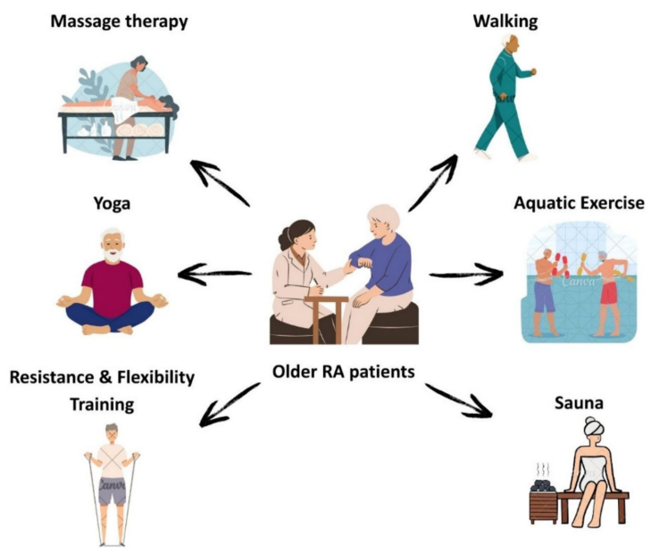 这篇综述系统探讨了体力活动(PA)对老年类风湿关节炎(RA)患者的多维益处,涵盖步行、水疗、桑拿/按摩及瑜伽等干预措施。证据表明,结构化运动可降低疾病活动度(DAS28)、减轻疼痛疲劳,并改善免疫功能(如调节CD14+/CD16+单核细胞),同时强调穿戴设备(如加速度计)对个性化管理的价值。欧洲抗风湿病联盟(EULAR)和美国风湿病学会(ACR)指南支持将运动整合为RA核心治疗策略。