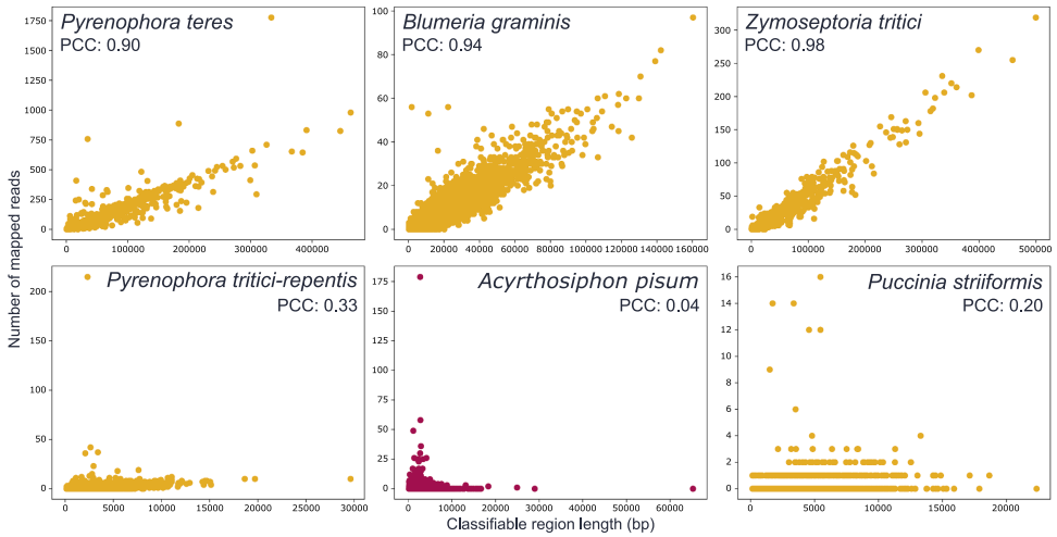在13种当地已报道的基因组已知病原体中,11种被成功检出。但信号强度差异显著:大麦网斑病菌(Pyrenophora teres)读数达174,190条,而禾谷缢管蚜(Rhopalosiphum padi)仅5条。通过人工合成读数测试发现,参考基因组污染会导致严重误分类——条锈菌(Puccinia striiformis)读数被错误归类至螨类(Medioppia subpectinata)。