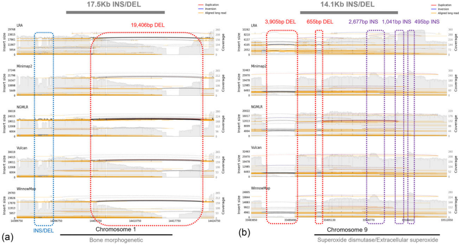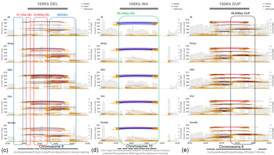 通过MUMmer软件进行全基因组比对,发现11263-11520个SV事件。其中插入(INS)和缺失(DEL)占主导(97.8%-98.2%),平均SV长度达953-1050bp。特别值得注意的是,Minimap2在计算效率与SV检出率间展现出最佳平衡,而NGMLR虽检出率低但能识别独特SV类型。