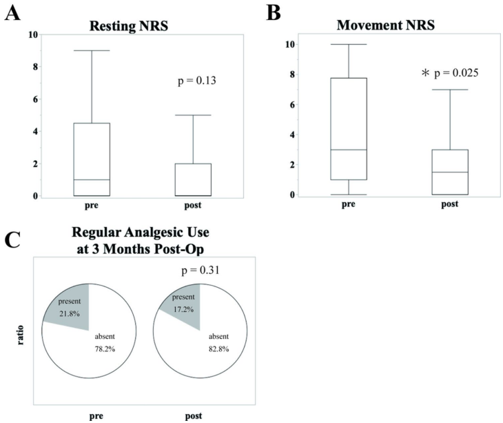 3个月随访数据显示,MDT组运动相关NRS评分显著改善(4.2±3.5 vs 2.1±2.4, p=0.025),这可能是由于急性期疼痛控制阻断了疼痛敏化进程。虽然规律镇痛药使用率无统计学差异(21.8% vs 16.9%),但运动痛觉的减轻直接提升了患者康复质量。