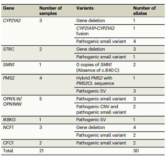 研究人员最后使用Paraphase分析了三个已知的医学相关旁系同源基因组(CYP21A2/CYP21A1P,PMS2/PMS2CL和OPN1LW/OPNMW)。