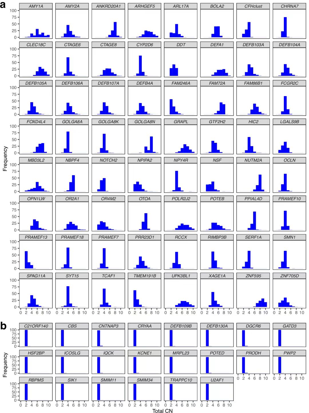 图2. 各旁系同源基因组的总CN在人群中的分布