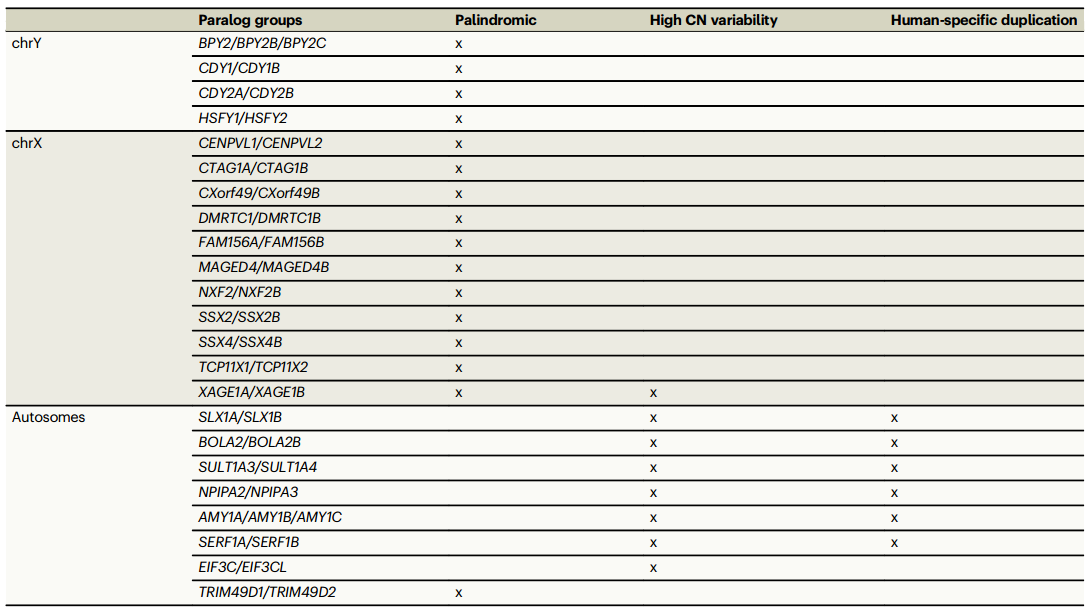 Paraphase从259个样本中的160个旁系同源基因组中鉴定出159795个单倍型。广泛的基因转换和不平等的交换可以导致高度相似的基因拷贝,这些拷贝不再能够单独基于序列被分成不同的基因。例如,SMN1和SMN2在外显子7-8中的序列不同,但在外显子1-6中不可区分。研究基于单倍型间的差异指标确定了23个低多样性旁系同源基因组,其中4个位于chrY,11个位于chrX,8个位于常染色体(表2)。这些基因组在其基因组结构、CN变异性和进化历史上显示出两种不同的模式:常染色体上的基因组具有高CN变异性,并且许多是人类特异性重复;相反地,性染色体上的基因组大多具有低CN变异性,以回文结构排列并且在进化上保守。