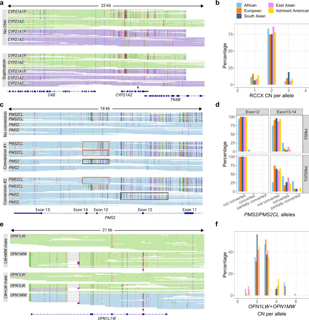 OPN1LW和OPN1MW负责红绿色觉缺陷和其他视觉疾病。该区域以基因阵列排列,并且仅表达阵列中的前两个基因。Paraphase能够识别重复序列的所有拷贝,将基因分配给OPN1LW或OPN1MW,并识别每个阵列中的前两个拷贝。图3e显示了具有OPN1LW和OPN1MW各一个拷贝的等位基因(上图),和仅具有OPN1LW的等位基因(下图),这会导致色觉缺陷。分析表明,这个同源组的总拷贝数在不同人群之间变化很大(图 3f)。