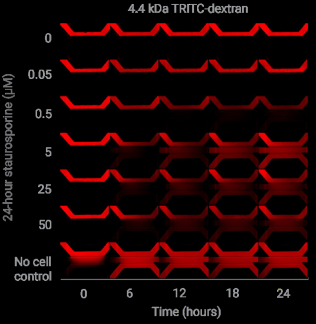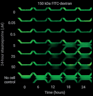 3. 屏障完整性检测:在培养的第6天,向培养基通道1中加入含有荧光染料(FITC-Dextran 150 kDa,TRITC-Dextran 4.4 kDa)和凋亡诱导剂staurosporine(0至50µM)的培养基,并立即使用BioTek Cytation 1细胞成像多功能微孔板检测系统开始成像。Cytation 1的内部温度设置并维持在37ºC,每小时捕获一次每个OrganoPlate芯片的荧光图像,持续24小时。