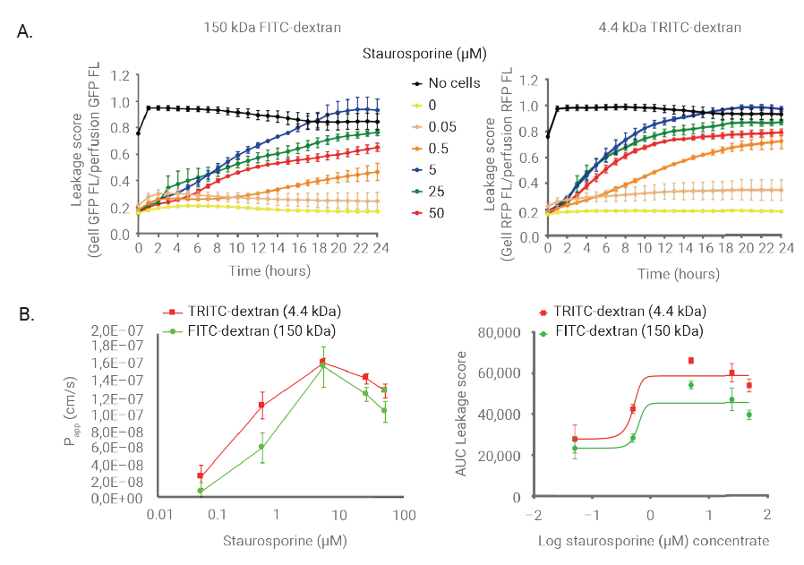 图5 显示在staurosporine处理的细胞中,观察到剂量和时间依赖性的屏障完整性丧失,表现为两种荧光染料从培养基向凝胶通道的泄漏。通过计算泄漏分数和表观渗透率(Papp),进一步量化了屏障功能的破坏程度。
