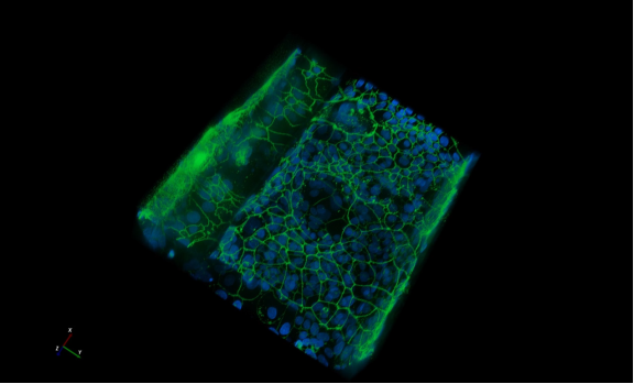 图7. Caco-2 OrganoPlate 的 3D 渲染。使用安捷伦 BioTek Cytation C10 共聚焦成像系统在 40 倍物镜下获取共聚焦荧光图像。以 1 um的步进在多个 z 高度采集 3x3 图像拼接,跨越 150 微米的 Z 高度范围。细胞核用 Hoechst 33342 标记,细胞膜用 GFP 标记。3D 渲染使用安捷伦 BioTek Gen5 软件中的 3D 查看器工具生成。