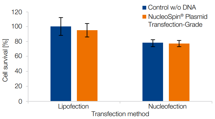 使用 NucleoSpin® Plasmid Transfection-grade 从大肠杆菌中纯化 pCMV-GFP 质粒,通过脂质体转染(Lipofectamine 2000)或核转染(Lonza)将质粒转染到 HEK239 细胞中,在两种情况下转染率均 > 90%。将细胞存活率与未添加 DNA 的对照组进行比较。相似的比例表明,使用 NucleoSpin® Plasmid Transfection-grade 纯化的 DNA 洗脱液不会影响细胞存活率。