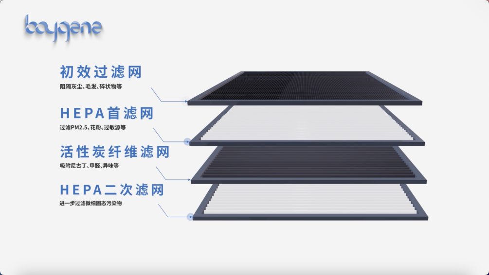 双层H14级HEPA滤网:能高效截留捕捉0.3μm以上颗粒(气溶胶大多>0.3μm,经过这一层后基本被完全截住,不再扩散)如气溶胶、细菌、病毒残片。