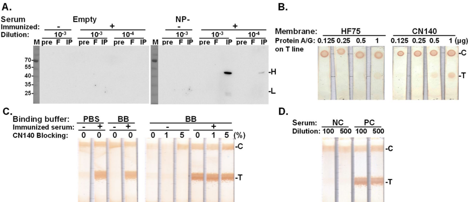 "The design of NP Ab-LFA"创新性地采用蛋白A/G捕获多物种抗体,MNPs增强免疫复合物富集。CN140膜在5% BSA条件下表现最佳,储存5个月稳定性良好。