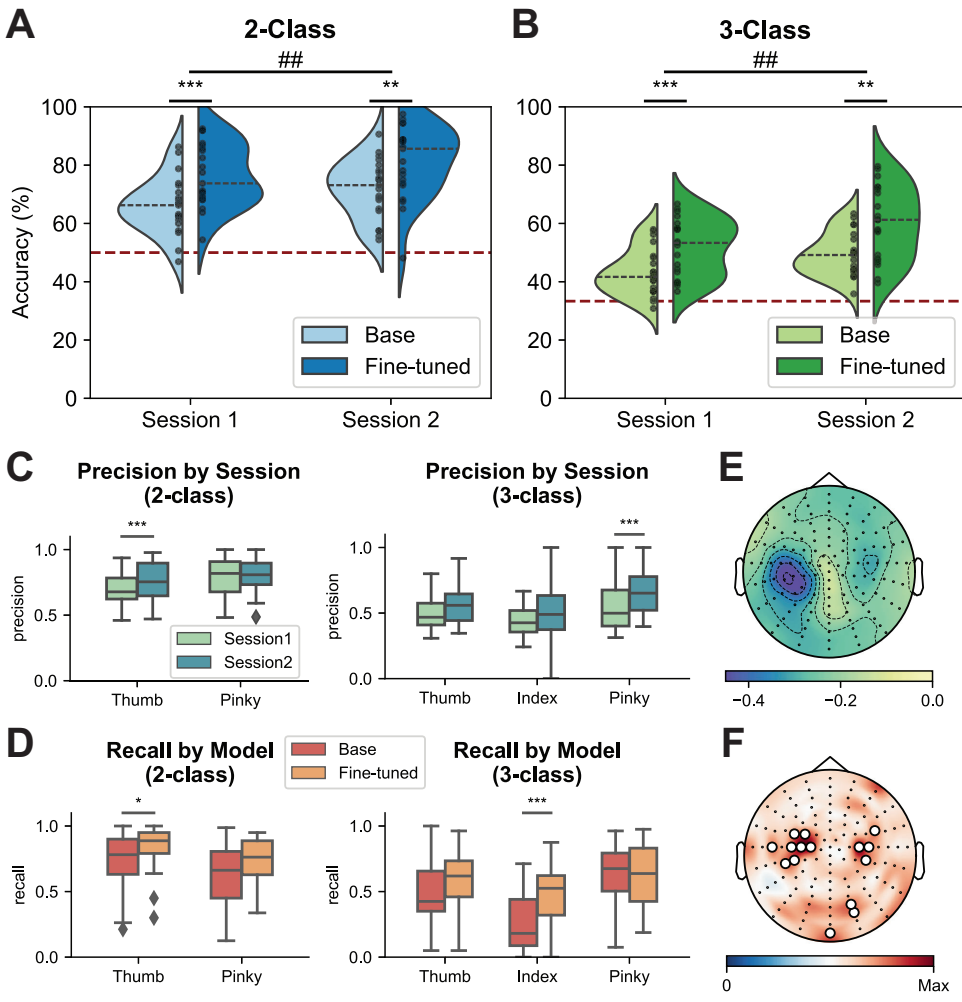 该研究首次实现非侵入式EEG-BCI对个体手指运动的自然映射控制,响应延迟仅1秒,媲美部分植入式系统。深度学习成功克服了EEG空间模糊的固有局限,而微调策略有效缓解了跨会话变异问题。值得注意的是,拇指-小指配对的解码性能最优(离线77.58%),而相邻食指-中指最难区分,符合皮层表征的体拓扑分布规律。