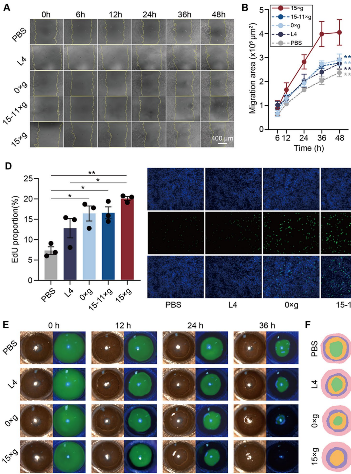 研究采用多学科交叉技术:(1)PRP系统整合流体力学模拟(COMSOL软件)优化力学参数;(2)超速离心结合纳米颗粒追踪分析(NTA)分离表征sEVs;(3)转录组与蛋白质组学解析机械应力响应机制;(4)角膜划痕实验(scratch assay)和EdU增殖检测评估再生效果;(5)小鼠角膜上皮损伤模型验证治疗效能。所有实验均使用3例供体来源的脐带MSCs(P6代以内)。