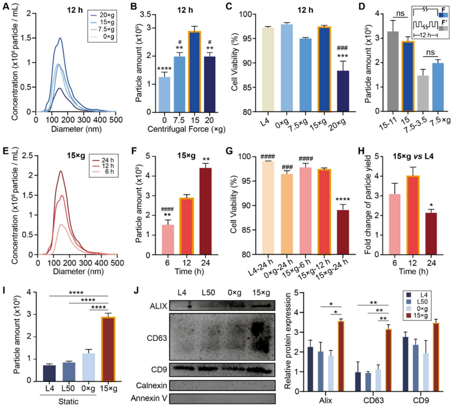 15xg恒定离心力12小时为最优参数,sEVs产量达静态培养4倍(粒径稳定在40-200nm),且Western blot验证标志蛋白Alix/CD9高表达。