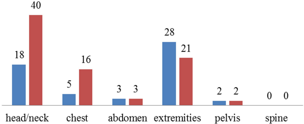 流行病学特征:78.8%患者为26-45岁男性,60.6%因交通事故受伤,86.9%属于钝器伤。四肢损伤占比49%,显著高于胸腹部损伤(21% vs 6%)。