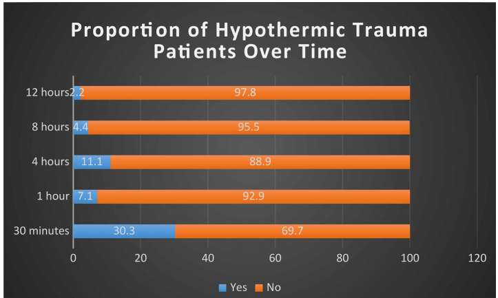 研究团队采用前瞻性观察设计,通过布劳恩红外鼓膜温度计精准监测体温。他们创新性地建立多时间点监测体系(30分钟至12小时),并系统记录损伤部位、转运方式等15项变量。统计模型采用STATA 17进行多因素逻辑回归,严格控制年龄、损伤机制等混杂因素。特别值得注意的是,研究排除了糖尿病等基础疾病患者,确保结果纯粹反映创伤本身的影响。
