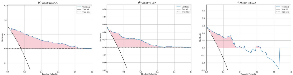 最终整合模型展现出卓越的临床价值:训练集AUC 0.940,外部验证集仍保持0.898。决策曲线分析证实,该模型在广泛阈值概率范围内具有净获益(图8)。