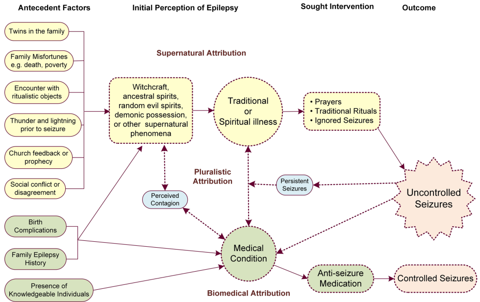 研究揭示令人深思的现象:即使全部样本均来自生物医学机构,超自然归因仍占主导。如图1所示,58.6%参与者坚信癫痫纯属超自然现象,20.7%持生物-超自然双重归因。这种认知直接导致治疗延误——多数家庭首选祈祷或传统仪式,直到发作加剧才寻求医疗帮助。典型案例中,一名学生被牧师勒停抗癫痫药物(ASM),声称"上帝能治愈一切",结果发作频率暴增,几乎酿成悲剧。