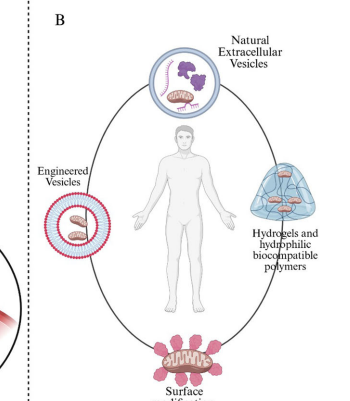 研究指出天然线粒体转移途径(如隧道纳米管TNTs和微囊泡MVs)存在效率低下和异质性问题。实验数据显示,游离线粒体在体外2小时内即丧失呼吸功能,而EVs封装可使线粒体在2mM Ca2+和100mM H2O2环境下维持24小时活性。