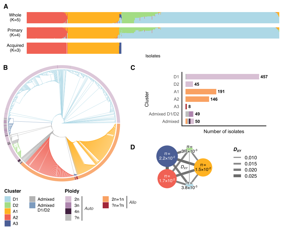 基于全基因组SNP的系统发育分析将种群划分为四个主要分支:二倍体集群D1(原Wine 3)和D2(原Kombucha),异源多倍体集群A1(原Beer)和A2(原Wine 1)。值得注意的是,A1集群可进一步分为三个遗传亚群,且与生态来源相关——大多数啤酒分离株集中于A1.1亚群。