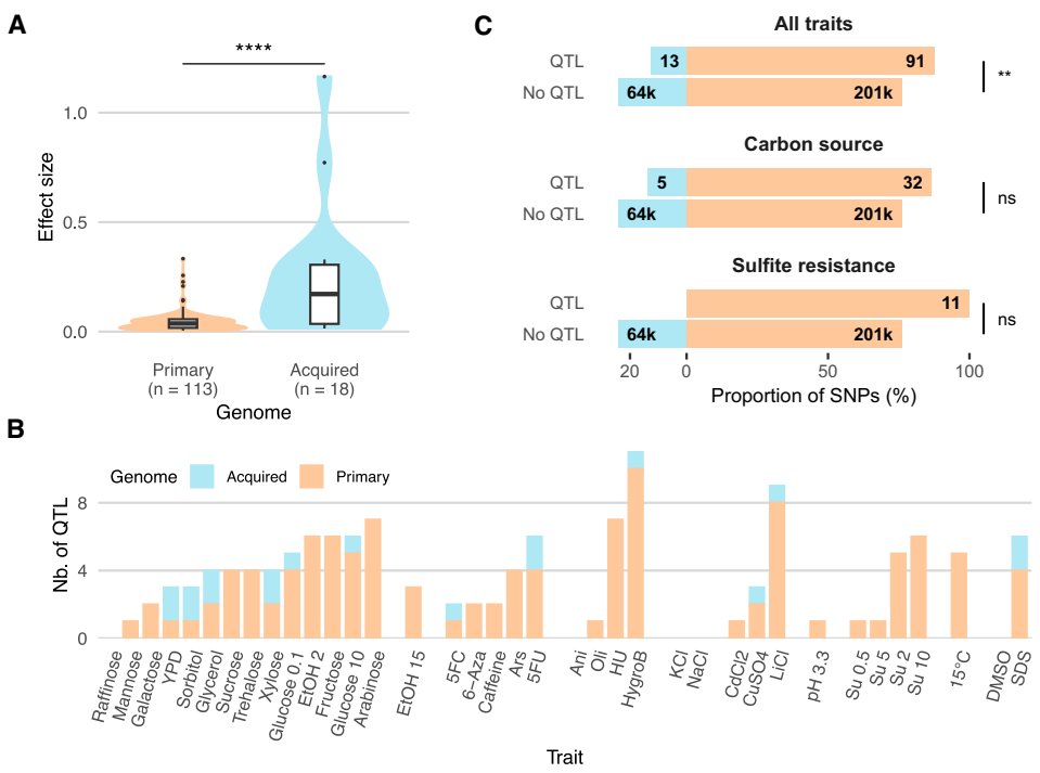 法国斯特拉斯堡大学等机构的研究团队在《Nature Communications》发表重要成果,通过对1060株自然分离菌株的全基因组测序和表型分析,首次在种群尺度揭示了异源多倍化对酵母表型景观的塑造机制。研究发现异源多倍体菌株表现出更极端的表型特征,且获得性基因组(acquired genome)的遗传变异对表型的影响效应值显著大于原始基因组(primary genome)。这一发现为理解多倍化在真核生物适应性进化中的作用提供了新视角。