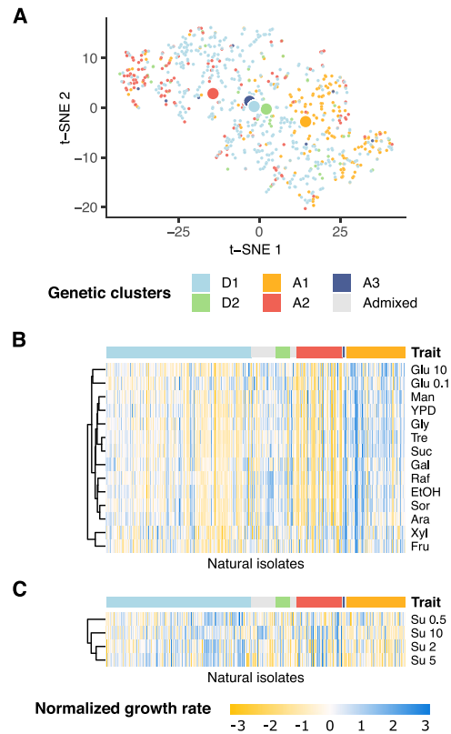 通过38种生长条件(碳源利用、亚硫酸盐抗性等)的表型分析发现,异源多倍体菌株显著富集极端表型(图4)。A1菌株在碳源利用上优于A2,而A2表现出更强的亚硫酸盐抗性,这种分化与酿酒环境适应性直接相关。