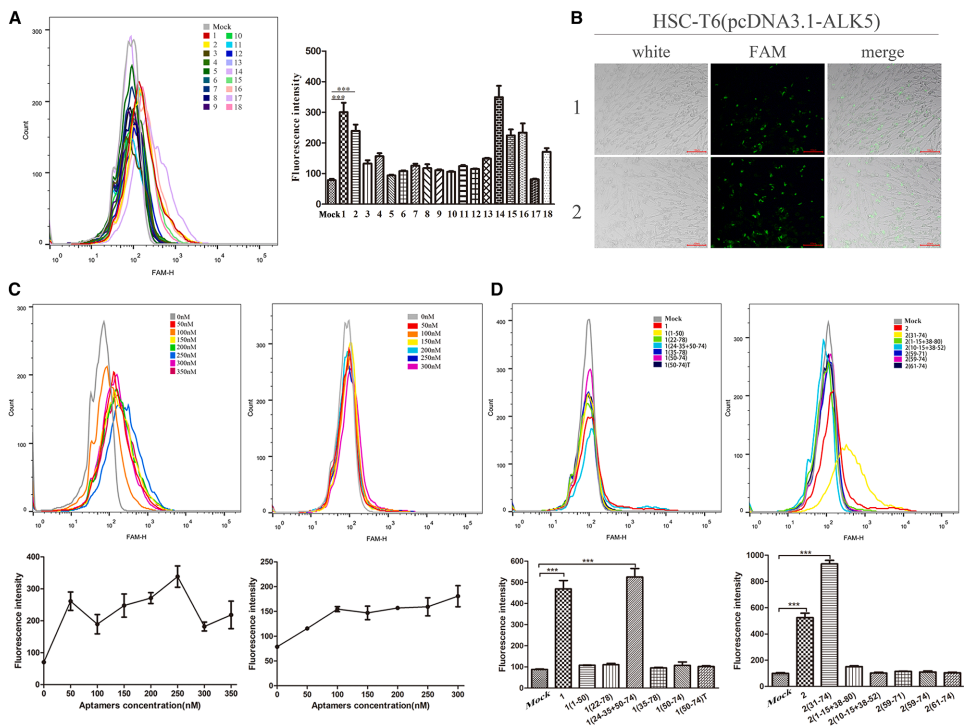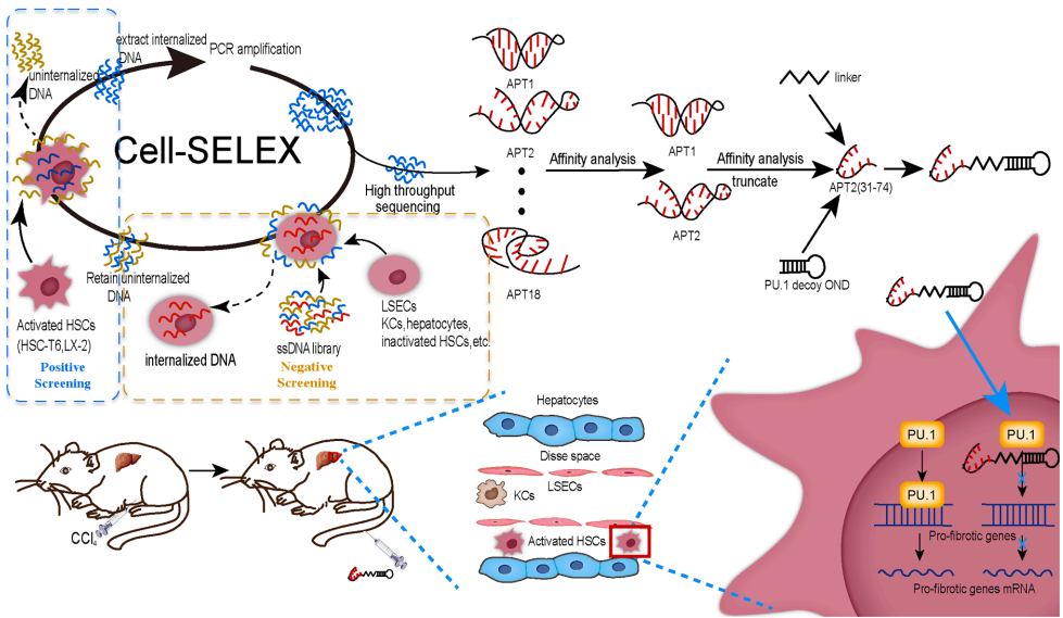 通过11轮Cell-SELEX筛选获得18个候选适配体,其中APT1和APT2显示出最强内化能力。经截短优化后获得的Apt-Tan在400 nM浓度下达到饱和,血清半衰期约4小时,能特异性进入活化HSC-T6细胞而非其他对照细胞。抑制剂实验表明其内化依赖细胞膜蛋白受体和窖蛋白介导的内吞作用。
