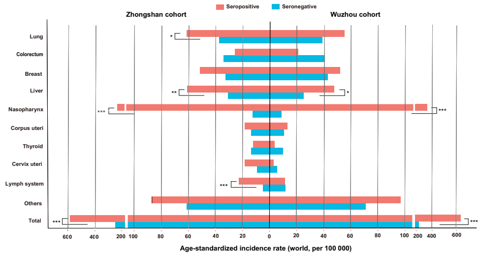 VCA-IgA阳性组总癌症年龄标准化发病率(ASR)显著高于阴性组:中山队列(592.73 vs 253.77/10万人年,P=1.32×10-9),梧州队列(650.10 vs 262.45,P=2.81×10-11)。除预期的鼻咽癌差异外,中山队列阳性组肺癌(62.75 vs 37.16)、肝癌(60.65 vs 31.30)和淋巴瘤(22.67 vs 5.39)的ASR均显著升高。