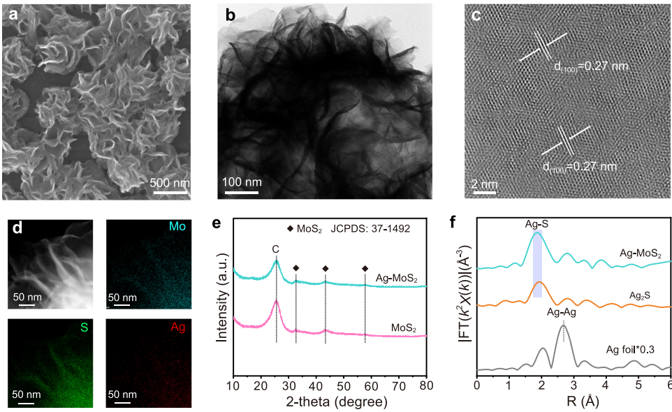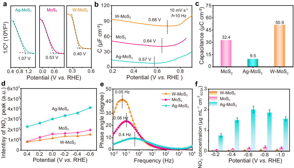 中南大学联合德国慕尼黑大学团队在《Nature Communications》发表研究,通过水热法合成Ag掺杂MoS2纳米花催化剂,结合同步辐射XAFS、原位拉曼光谱、交流伏安法(ACV)等技术,证实Ag-S配位诱导p型半导体特性,利用Mott-Schottky测试量化能带弯曲程度,并通过有限元模拟和同位素标记实验验证NO3-富集机制。