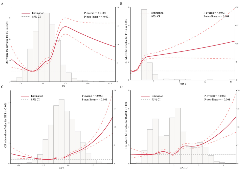 LFSs与CVD显著正相关:完全校正模型显示,FS、NFS、FIB-4和BARD评分每增加1单位,CVD风险分别增加50%、50%、39%和54%。四分位分析中,最高分位组风险可达最低组的4.63倍(FS)和2.74倍(NFS)。