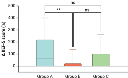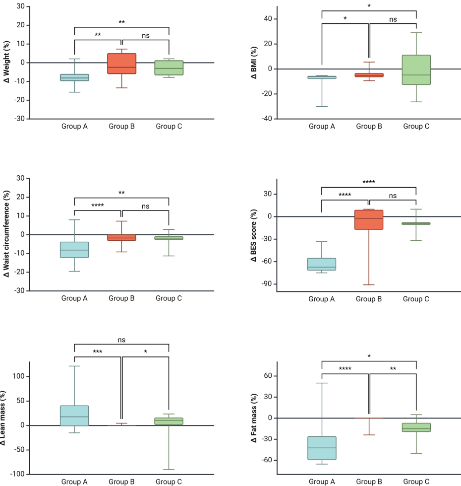83例患者(平均BMI 34.9 kg/m2)存在显著内分泌紊乱:TT中位数186 ng/dL(低于诊断阈值264 ng/dL),所有患者均伴有ED(IIEF-5评分5-12分)。A组基线暴食倾向(BES评分24分)和内脏脂肪更高。