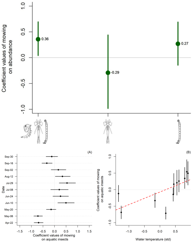 通过119次采样记录显示,刈割使昆虫总丰度提升36%(90%CI:0.04-0.69),但存在显著的分类群差异。摇蚊幼虫在刈割区丰度增加27%,而豆娘幼虫减少29%。