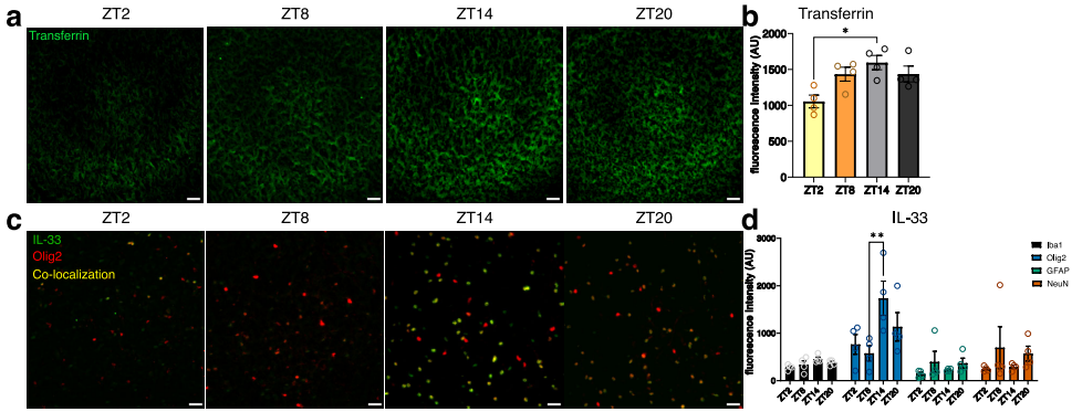 WGCNA分析显示,皮层grey60模块同时包含少突胶质细胞(Olig2)、星形胶质细胞(GFAP)和内皮细胞标记基因,其枢纽基因转铁蛋白(Transferrin)呈现典型的昼夜振荡(ZT14达峰)。免疫荧光证实IL-33在少突胶质细胞中的节律性表达,而AdipoR2在下丘脑神经元中特异性振荡,揭示神经-免疫互作的时空编码机制。