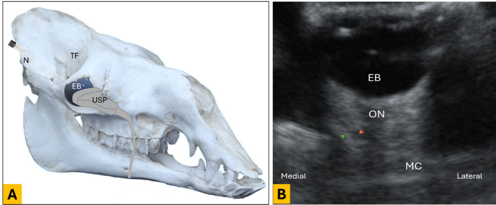 在大型动物临床实践中,骆驼因其独特的生理特性使得全身麻醉风险显著增高。传统盲法神经阻滞虽常用于眼科手术,但存在误伤血管或神经的风险。尤其在进行胸骨卧位手术时,如何实现安全有效的眼部麻醉成为临床难题。此前超声引导技术已在犬、马等动物中成功应用,但针对骆驼这一特殊物种的眶周神经阻滞(Peribulbar block, PB)技术仍属空白。