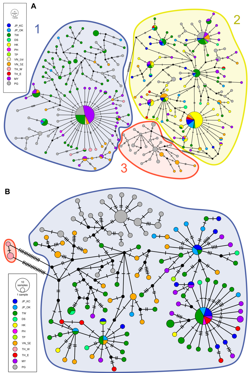 为探究宿主专一性对基因流动的影响,中央研究院等机构的研究人员聚焦印度洋-西太平洋海域三种宿主利用策略不同的珊瑚藤壶:广宿主型Cantellius euspinulosum(主要宿主为滨珊瑚Porites,兼栖7属珊瑚)、窄宿主型C. septimus(89%栖息于表孔珊瑚Montipora)和Darwiniella angularis(80%依赖Cyphastrea)。研究通过跨洋尺度采样(16个地点,516/165/828个样本),结合线粒体细胞色素c氧化酶亚基I(COI)基因序列分析,整合种群遗传多样性、单倍型网络、中性检验(Tajima's D/Fu's Fs)、错配分布(mismatch distribution)及贝叶斯天际线图(BSP)等方法,系统解析遗传结构与历史动态。