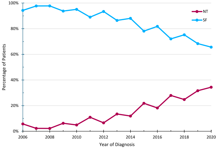 分析显示,17.5%患者接受NT(75%单用化疗,23.6%放化疗联合),82.5%直接手术。NT组患者更年轻(中位67岁)、白人比例高(90.9%),且多集中于2016-2020年(65.9%),反映近年治疗理念转变。