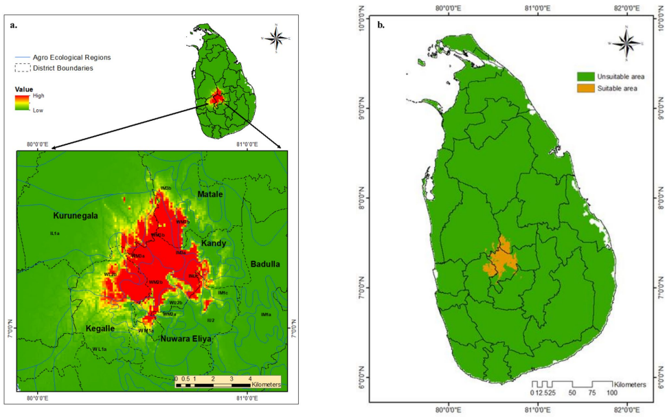 模型(AUC=0.986)显示除现有种植区外,库鲁内格勒和努沃勒埃利耶部分地区同样适宜种植,主要受最干月降水量(BIO14)和年温度范围(BIO7)驱动。