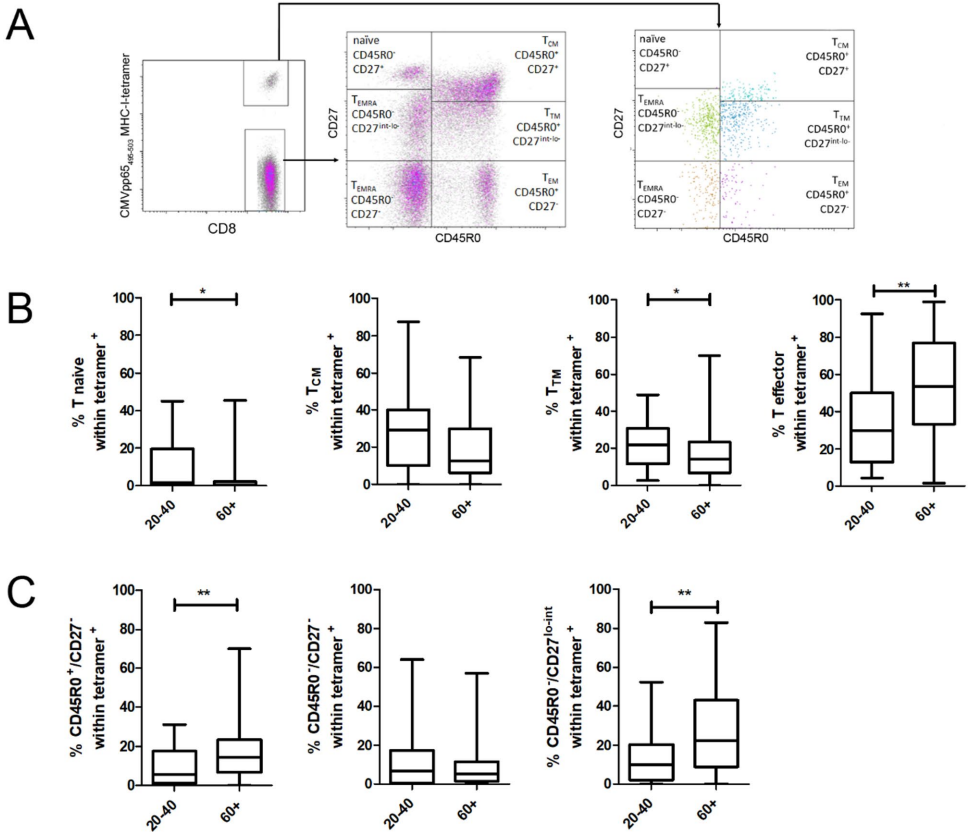 研究采用前瞻性队列设计,从居民登记系统随机招募20-100岁志愿者。关键技术包括:HLA-A02流式分型、CMV-IgG滴度检测(Abbott Architect系统)、TBNK六色流式绝对计数、新鲜PBMC直接进行MHC-I四聚体染色(CMVpp65495-503/HLA-A02:01复合物),配合CD27/CD45RO抗体区分T细胞亚群。统计分析采用广义线性模型校正年龄、性别和BMI等混杂因素。