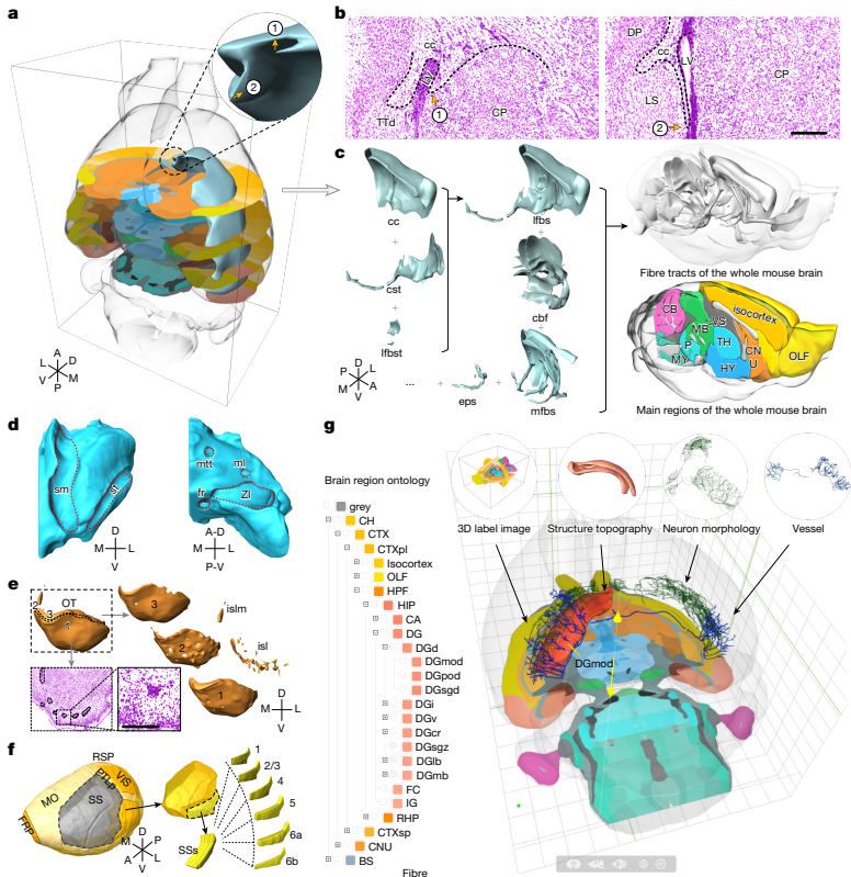 本研究团队通过连续微光学切片断层扫描技术,构建了首个具有1-μm各向同性分辨率的Nissl染色小鼠脑图谱STAM,解决了传统二维图谱分辨率不足、三维重建不精确的难题。该研究定义了916个脑区三维形貌,开发了支持任意角度切片生成、脑片配准和神经环路映射的信息学平台,为单细胞水平脑图谱研究提供了重要工具,相关成果发表于《Nature》。